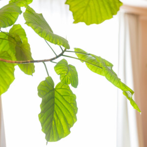 細かく枝分かれし、先端がしゅっととがった楕円形(だえんけい)の小さな葉を無数に展開するフィカス・ベンジャミナ。つるのように細い幹がよく伸び、自由に樹形を変えられます。白みがかった灰色の幹と、濃緑の葉が相まった姿が美しく、印象的なインテリアにもなります。