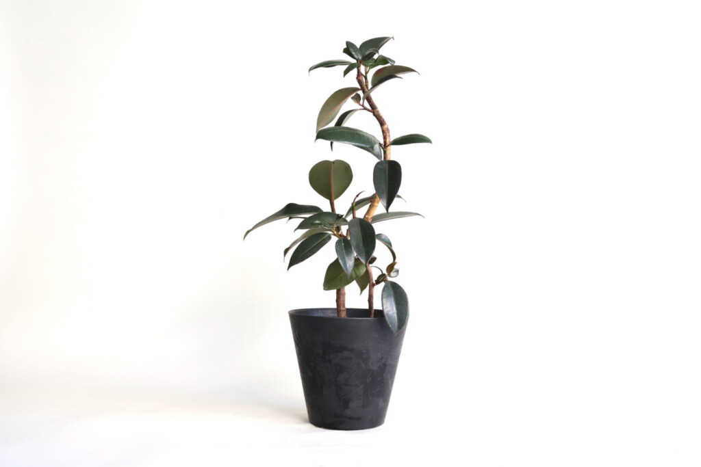 黒っぽい葉っぱが印象的なフィカス・バーガンディ。通称「黒ゴムの木」と言われるほど、濃い色の葉っぱをつけます。